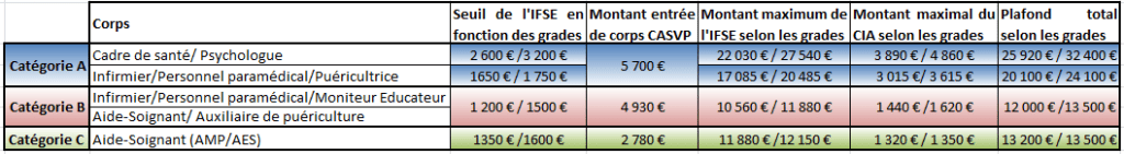 Le RIFSEEP ou régime indemnitaire tenant compte des fonctions, des sujétions, de l’expertise et de l’engagement professionnel, nouvel outil indemnitaire de référence qui remplace la plupart des primes et indemnités existantes dans la fonction publique, est mis en œuvre progressivement pour les corps de la fonction publique de l’Etat (FPE) et pour leurs cadres d’emplois homologues de la fonction publique territoriale (FPT). Applicable désormais dans les filières technique, administrative et sociale au CASVP, le dispositif devrait donc concerner l’ensemble des corps de la filière médicale et paramédicale (titulaires et contractuels de + de 3 mois) à compter du 1er juillet 2022.