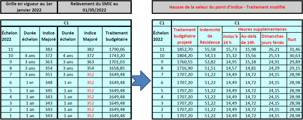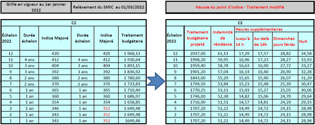 Exemple d’évolution de traitement pour les catégories C, sur la base de la valeur d’un point estimée à 4,85 € par mois : Adjoint.e administratif ou d’animation – Adjoint.e technique – Agent.e social.e du CASVP – Aide-soignant.e du CASVP spécialité AES (Accompagnants Éducatifs et Sociaux)/ AMP (Aides Médico-Psychologiques), sous réserve, bien entendu, des dispositions du décret qui doit être validé au premier conseil des ministres de juillet :