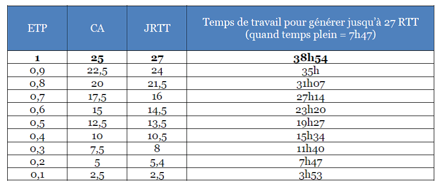 - sur 4,5 jours : 7h56 par jour, 3h58 la demi-journée ; possibilité de générer 3 RTT