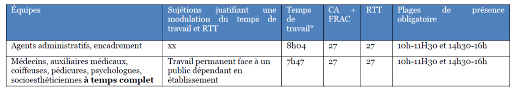 ● En cas de volonté de générer jusqu’à 27 RTT il vous faudra travailler 8h04 par jour pour les agents administratifs et l’encadrement (4h02 par demi-journée), 7h47 pour les médecins, les auxiliaires médicaux, les psychologues, les pédicures, les coiffeuses, et les socio esthéticiennes. Le temps maximal de travail décompté sur une journée est de 10 heures.