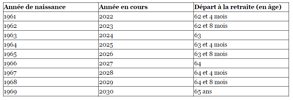 ● Âge de départ à la retraite entre 62 et 65 ans selon votre année de naissance pour vous donner une idée pour anticiper les décisions de la future nouvelle assemblée après la réforme Macron si cette dernière est votée. Ce tableau est spéculatif et donc non-officiel (sources EOR).