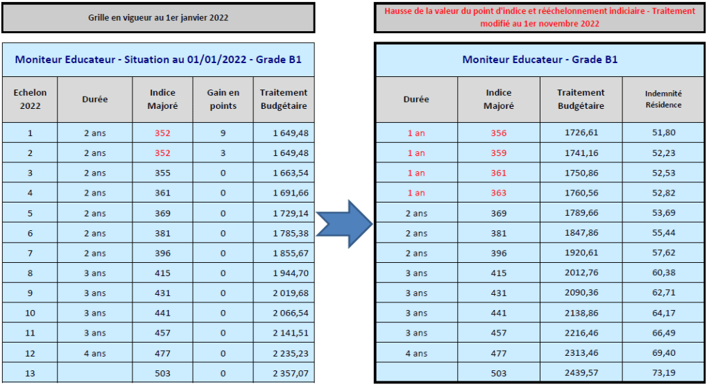– l’indice des quatre premiers échelons du premier grade et le 2e échelon du deuxième grade sont revalorisées.