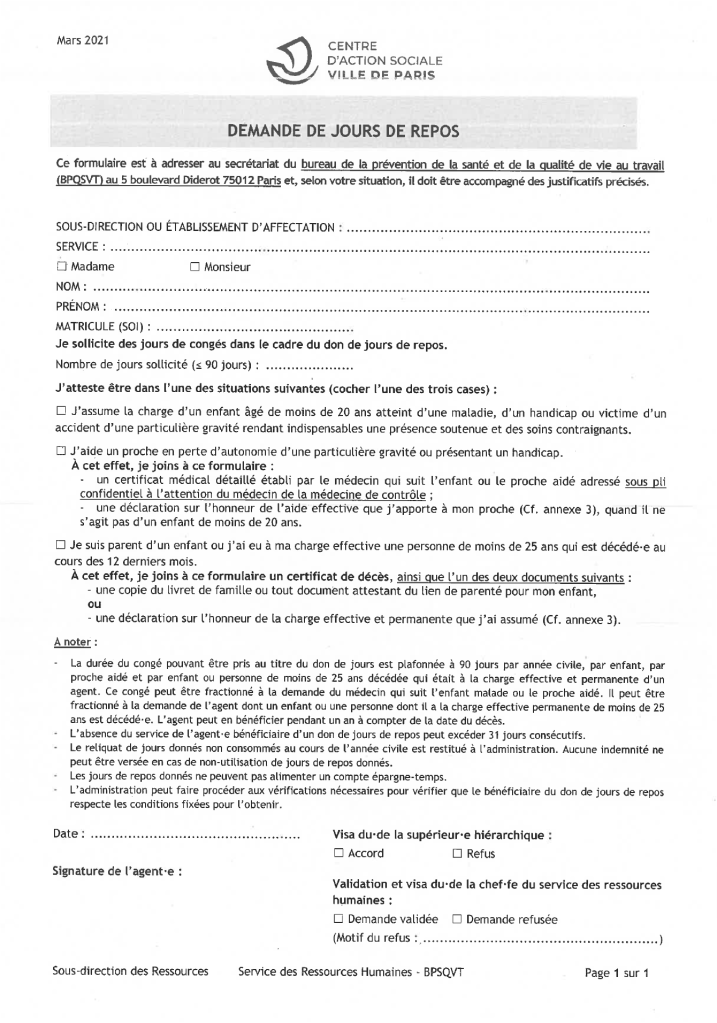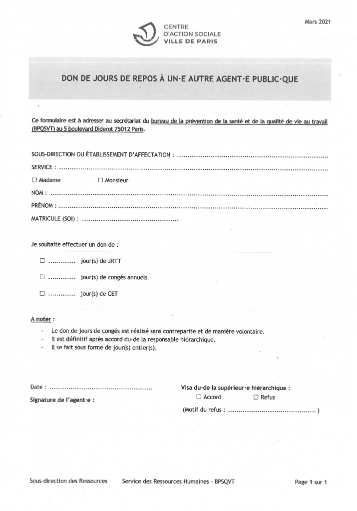 > L’agent·e (stagiaire, titulaire ou contractuel.le de droit public) qui souhaite donner des jours fait la demande par écrit (il existe un formulaire type). La procédure mise en place au CASVP veut qu’il.elle informe d’abord son.sa supérieur.e hiérarchique du nombre de jours de repos qu’il.elle souhaite donner. Celui.celle-ci vérifie que les conditions fixées sont remplies, comme par exemple que l’agent·e donateur a bien consommé au minimum 20 jours de congés annuels. La demande est adressée au secrétariat du Service de la Prévention et de la Qualité de Vie au Travail (ex-BPSQVT), à l’adresse suivante : 5, Bld. Diderot, 75012 PARIS.