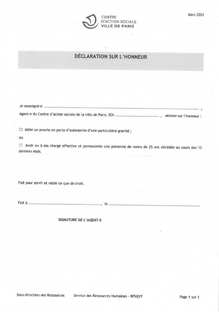 < L’agent·e (stagiaire, titulaire ou contractuel.le de droit public) qui souhaite bénéficier des dons de congés ne peut pas faire sa demande via le formulaire en ligne, réservé aux agent.es de la Ville et d’EPM. L’agent.e du CASVP doit produire une demande écrite accompagnée d’un certificat médical détaillé (sous pli confidentiel) daté de moins de deux mois, établi par le médecin qui suit l’enfant, ou la personne aidée attestant la particulière gravité de la maladie, de l’accident ou du handicap et de la nécessité d’une présence soutenue et de soins contraignants, qu’il adresse au secrétariat du SPQVT, 5, Bld. Diderot, 75012 PARIS. Bien que la demande puisse être réalisée sur papier libre, un formulaire-type et un certificat médical-type sont disponibles auprès de votre SLRH ou joints à cette publication.