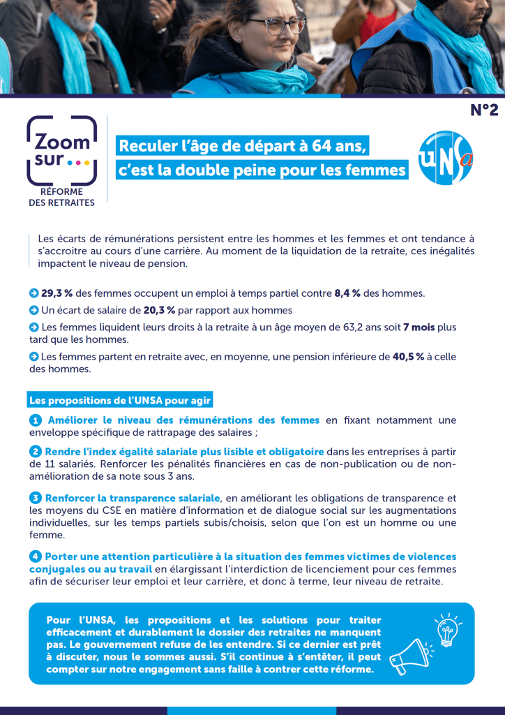 | Zoom n°1 : Reculer l’âge de départ à 64 ans, c’est 2 ans de liberté en moins [RECTIFIE] Zoom n° 2 : Reculer l’âge de départ à 64 ans, c’est la double peine pour les femmes Zoom n° 3 : Reculer l’âge de départ à 64 ans, c’est un lourd tribut pour les séniors [NOUVEAU] |