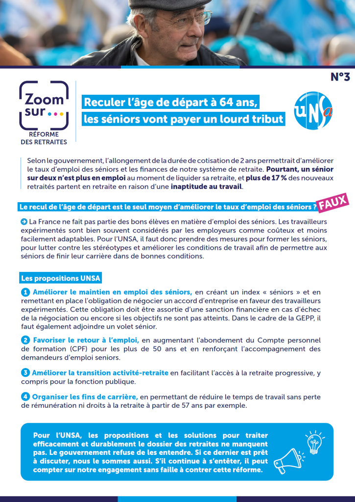 | Pour aborder des vérités et des contre-vérités, des chiffres clés ou encore nos propositions en matière de retraite, l’UNSA publie des fiches thématiques sur le projet de réforme. |