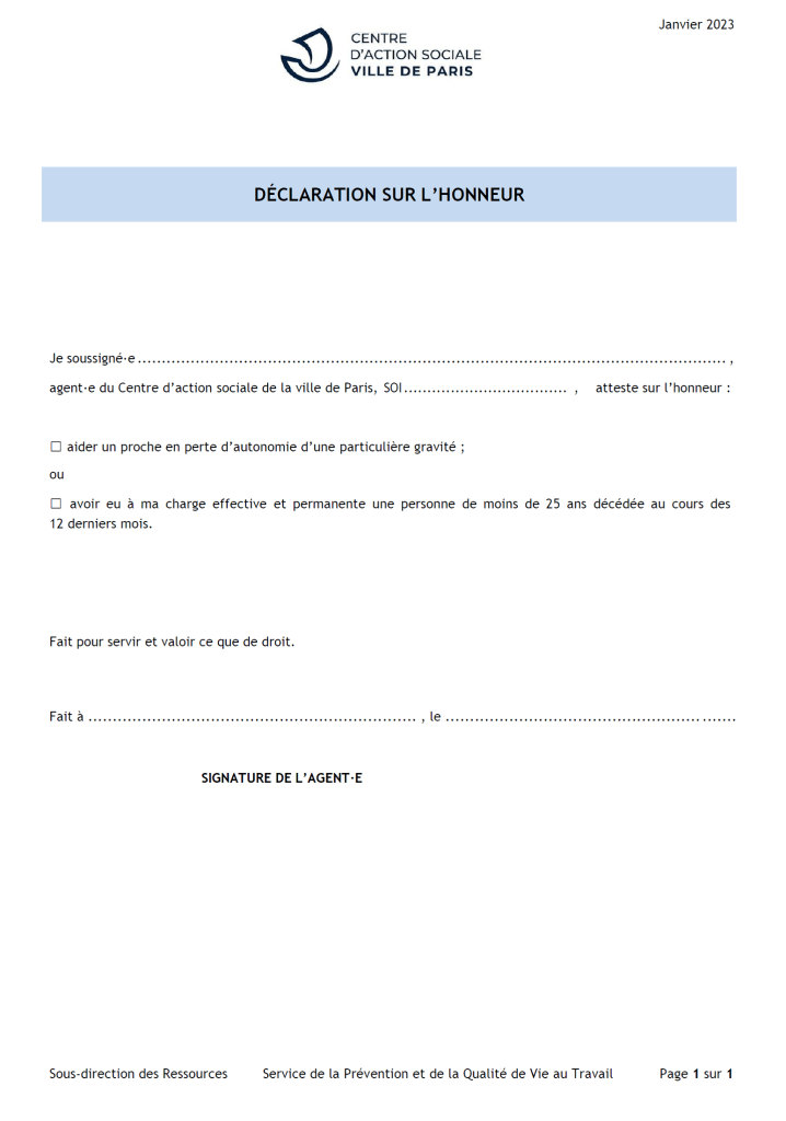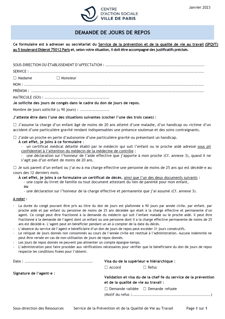 Si vous souhaitez bénéficier d’un don de jours, vous devez en informer par écrit votre administration. Votre demande doit être accompagnée d’un certificat médical détaillé daté de moins de deux mois, établi par le médecin qui suit l’enfant ou la personne aidée, attestant la particulière gravité de la maladie, de l’accident ou du handicap et de la nécessité d’une présence soutenue et de soins contraignants que vous adressez également au secrétariat du SPQVT, 5, Bld. Diderot, 75012 PARIS. Un formulaire-type et un certificat médical-type sont disponibles auprès de votre SLRH ou joints à cette publication.