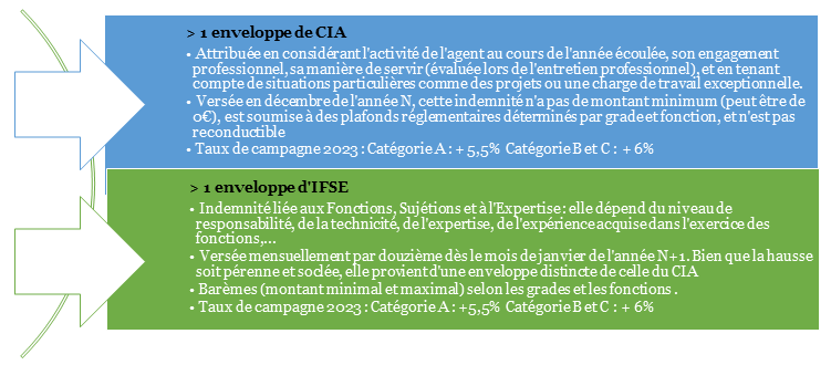 • Deux enveloppes financières distinctes : Dès la campagne 2023, le CIA et l’IFSE seront séparés. Ces primes pourront connaître des taux d’augmentation distincts. Ainsi, une augmentation du CIA une année n’entraînera pas nécessairement une hausse équivalente de l’IFSE l’année suivante.