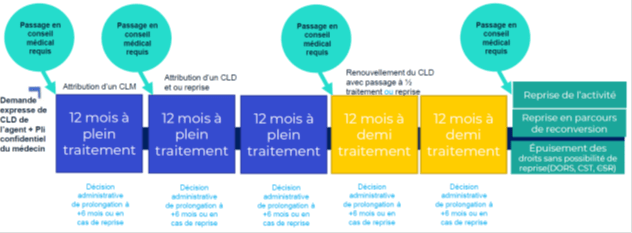 L’attribution du CLD est décidée après un avis favorable du conseil médical. Le CLD est octroyé pour une durée initiale maximale d’un an à plein traitement, pouvant être suivi d’une période à demi-traitement. La prolongation du CLD peut être accordée par périodes de trois à six mois.