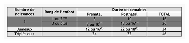 Le congé se divise en phases prénatale et postnatale, avec une durée variable selon le nombre d’enfants attendus et à charge.