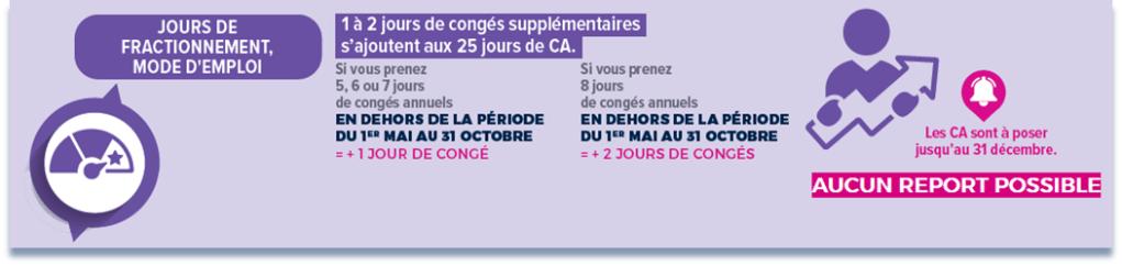 - 5 à 7 jours de congés annuels pris hors de la période du 1er mai au 31 octobre ouvrent droit à 1 jour de fractionnement ;