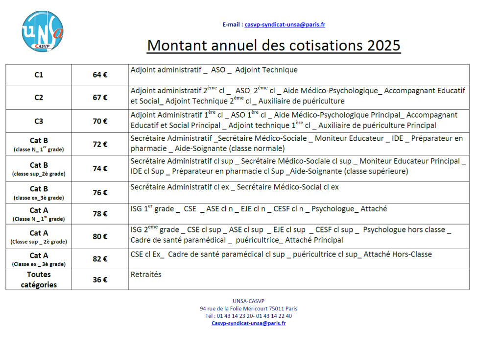 Pour adhérer à l’UNSA CASVP, il vous suffit de remplir un bulletin d’adhésion. Vous pouvez l’envoyer par courrier à l’adresse du syndicat, ou le remettre à un.e représentant.e de notre syndicat. Vous y joignez votre paiement (chèque à l’ordre de UNSA CASVP).